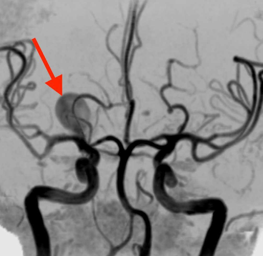 MRAで、右中大脳動脈に直径約5cmの巨大脳動脈瘤が見つかりました。破裂した場合、くも膜下出血を起こす危険があります。