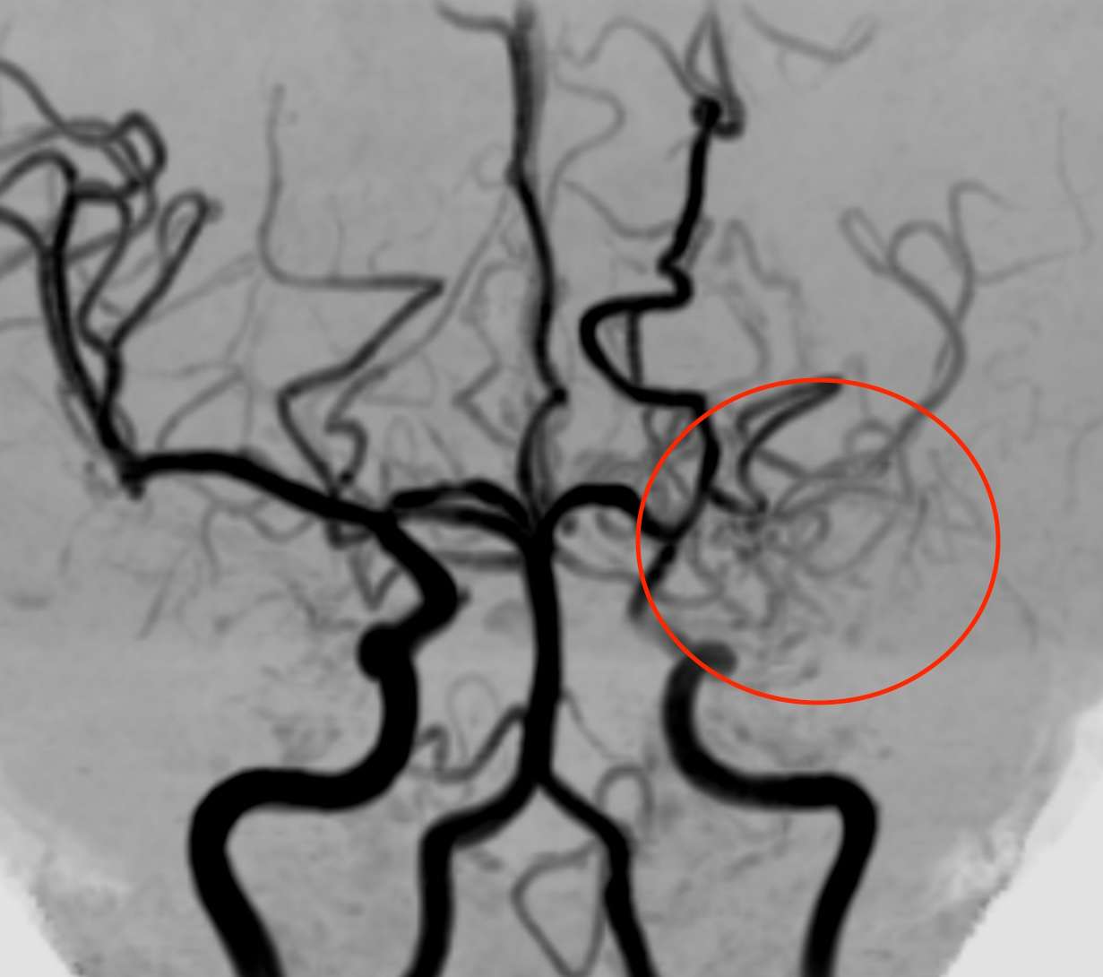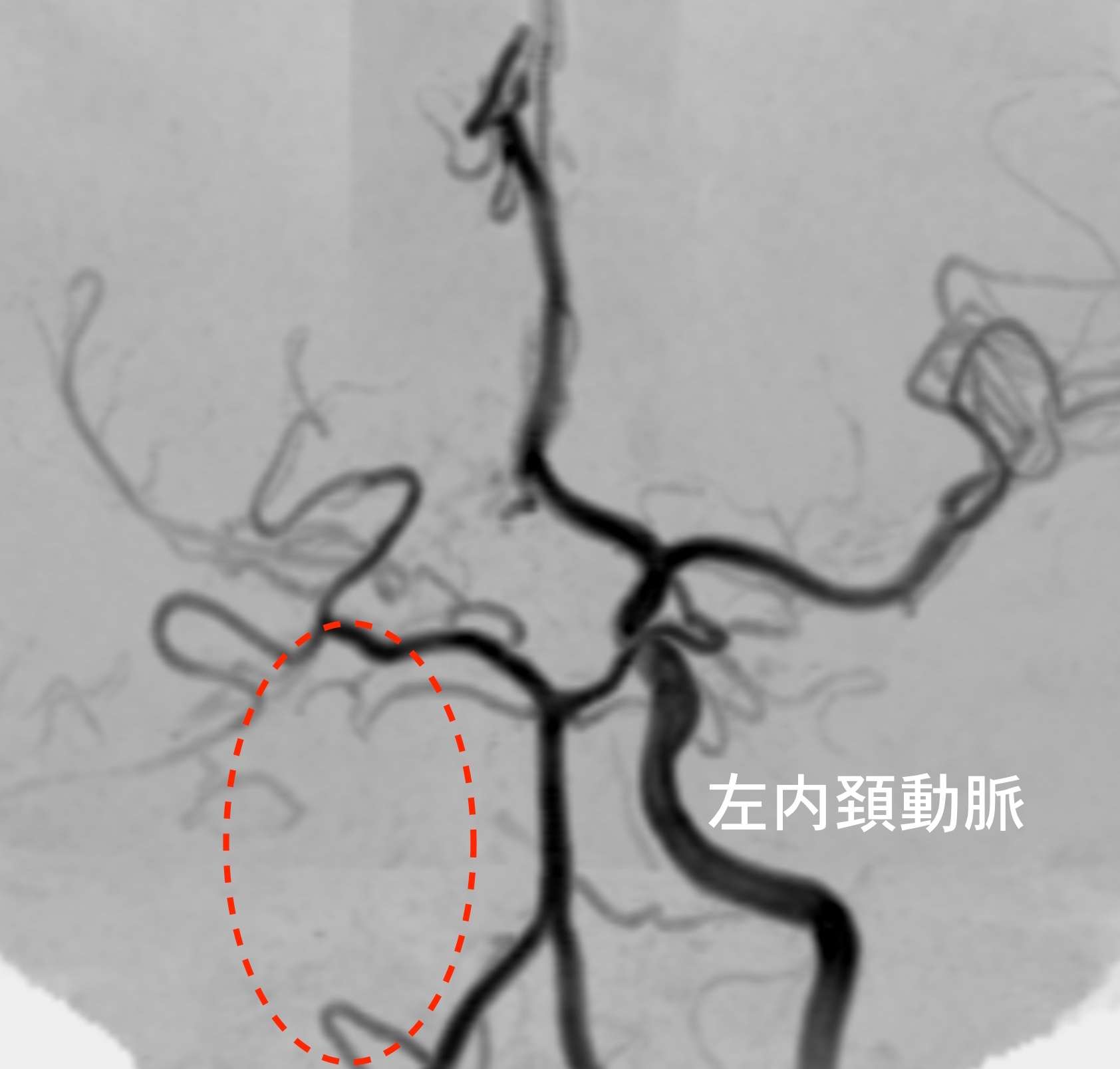 本来ならあるはずの右側の内頚動脈という血管が写っていません。その上の方も血管が全体的に細くなっています。(左内頚動脈は正常です)