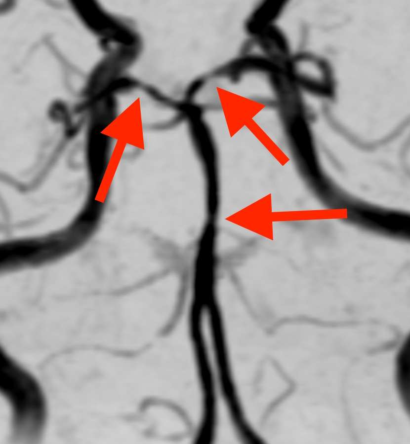 脳底動脈や後大脳動脈という血管が、所々くびれて細くなっています。