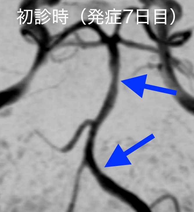 脳の血管が収縮して細くなった部分があり、可逆性脳血管攣縮症候群と診断。血管がけいれんして縮む状態で、トリプタンではさらに血管を縮めてしまい、全く効果はなく悪化する場合もあります。したがって、可逆性脳血管攣縮症候群では、血管を拡張する薬で治療します。また、痛みを脳に伝える三叉神経や交感神経が過敏な状態でもあり、これらを抑える薬を治療に加える事があります。当院では、片頭痛の予防にも使われる抗てんかん薬(バルプロ酸)やβ遮断薬(プロプラノロール)を必要に応じて同時に用いています。