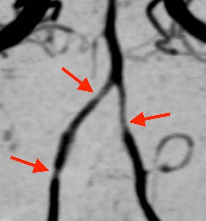 このように、脳の血管が所々で収縮して細くなっている状態が観察されます。まれに脳梗塞やくも膜下出血を合併する事があります。